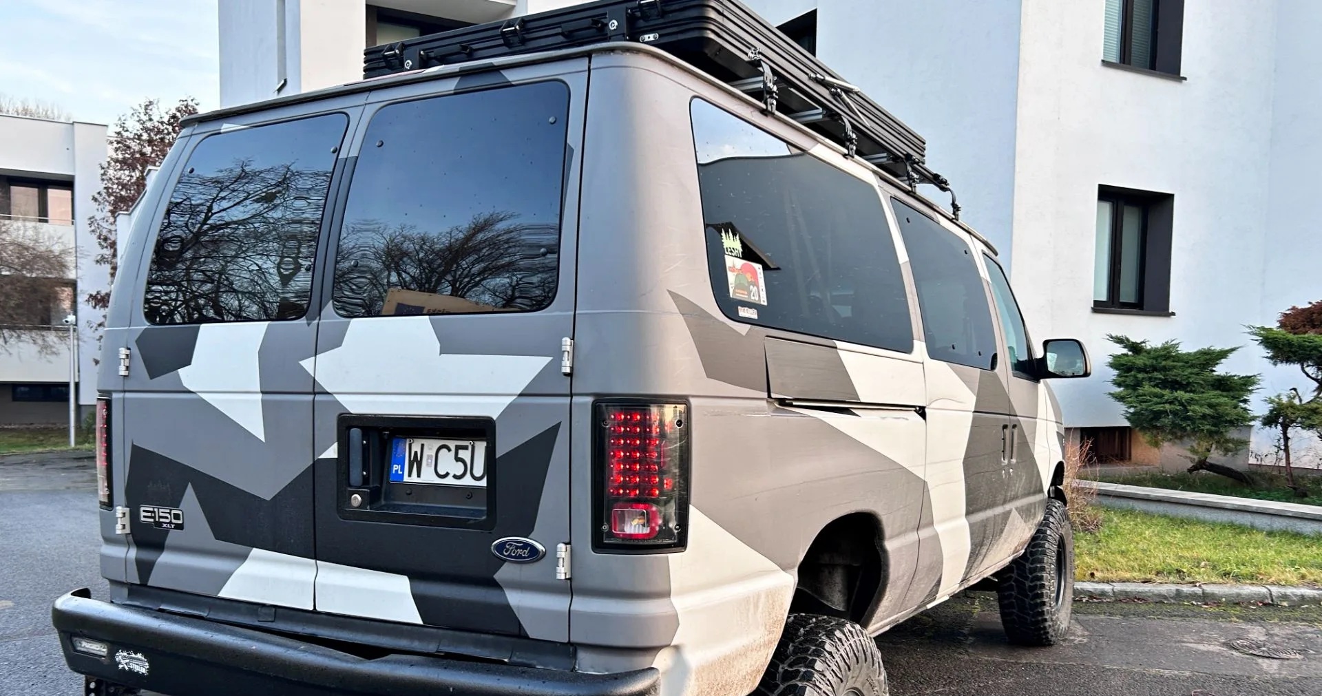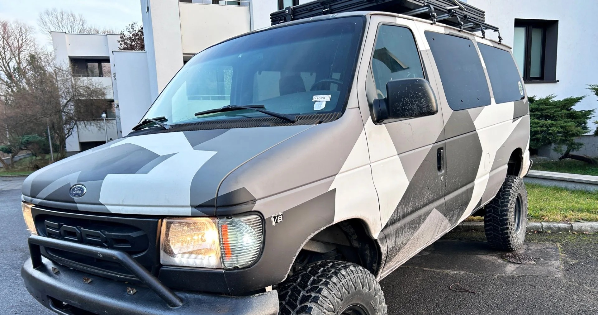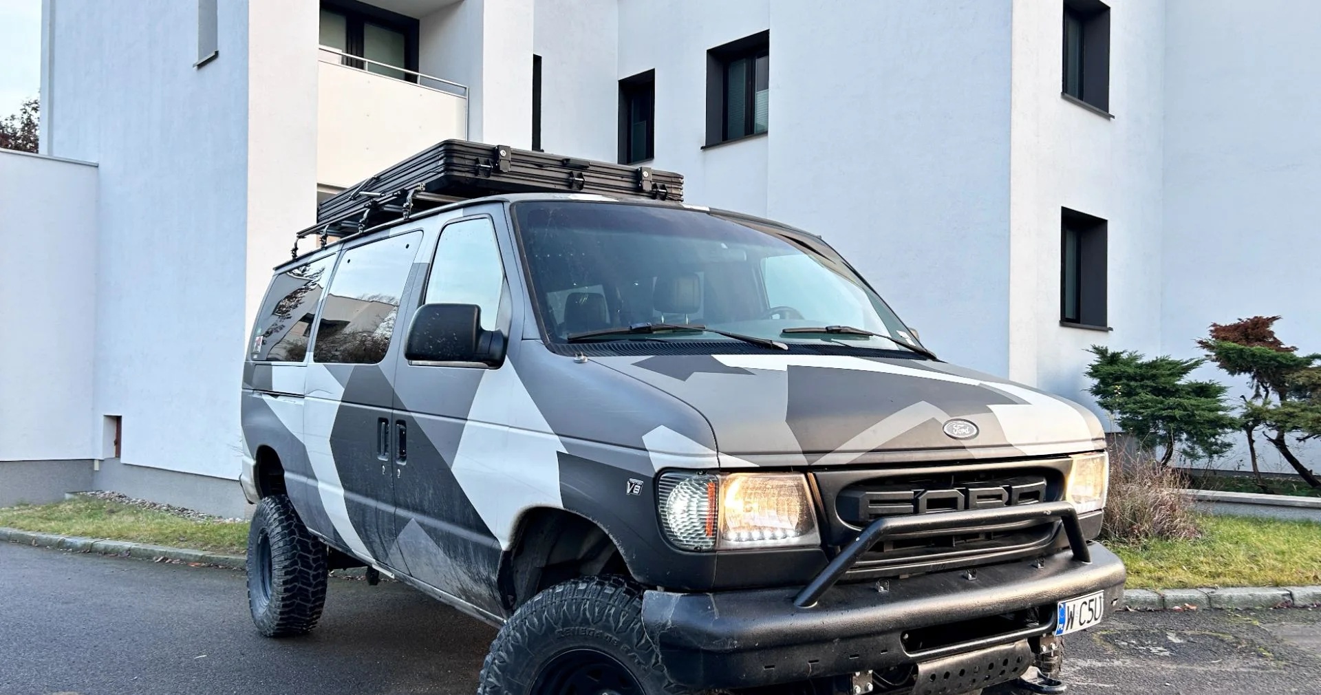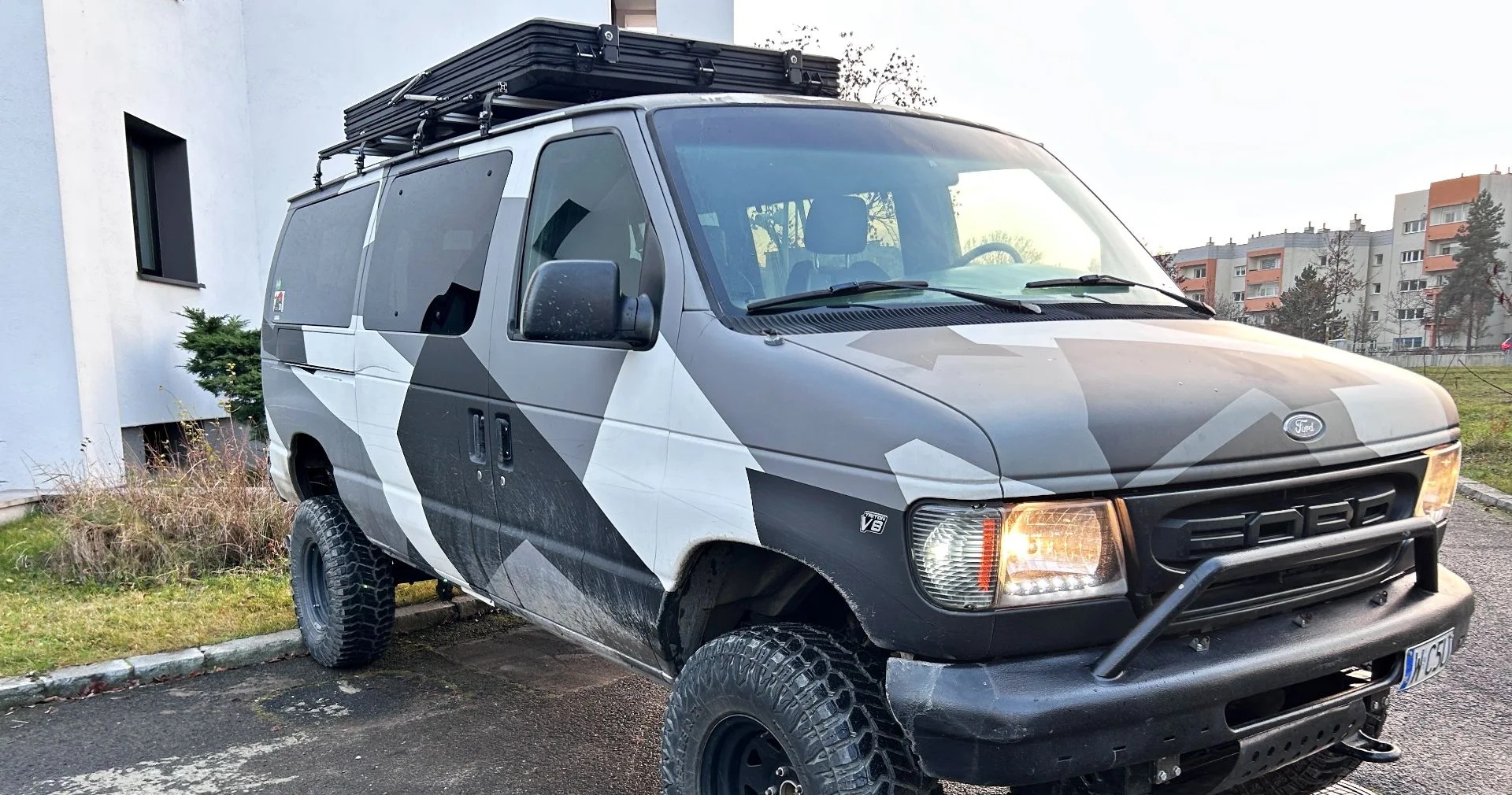 Przedstawiamy bardzo ciekawego Forda opartego na E150/F150, przebudowanego bez kompromisów. Zawieszenie FOX, opony RT 33″, 2 nagrzewnice, klimatyzacja, wydech z kwasówki 2,5″, dwa rzędy siedzeń z Range Rovera Sport.